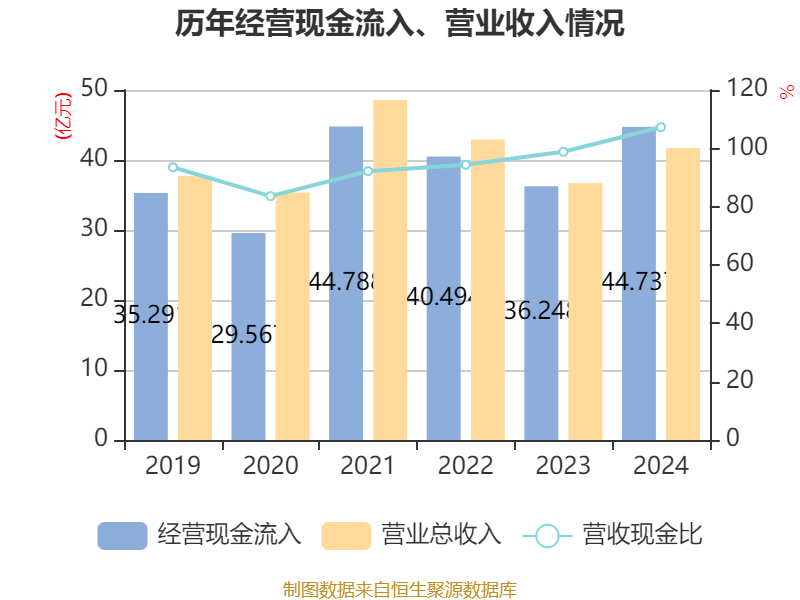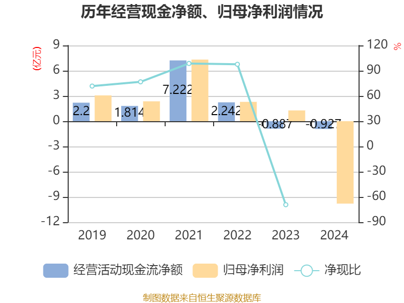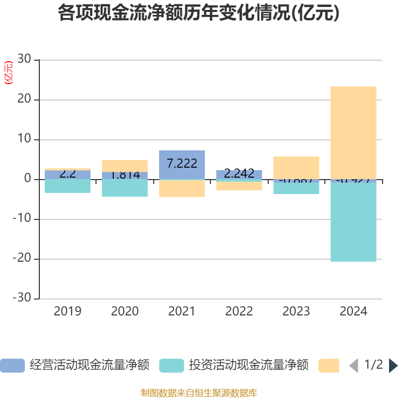 截至2024年,公司经营活动现金流净额为-9271.24万元,同比减少400.98万元;筹资活动现金流净额23.3亿元,同比增加17.61亿元;投资活动现金流净额-19.81亿元,上年同期为-2.88亿元。