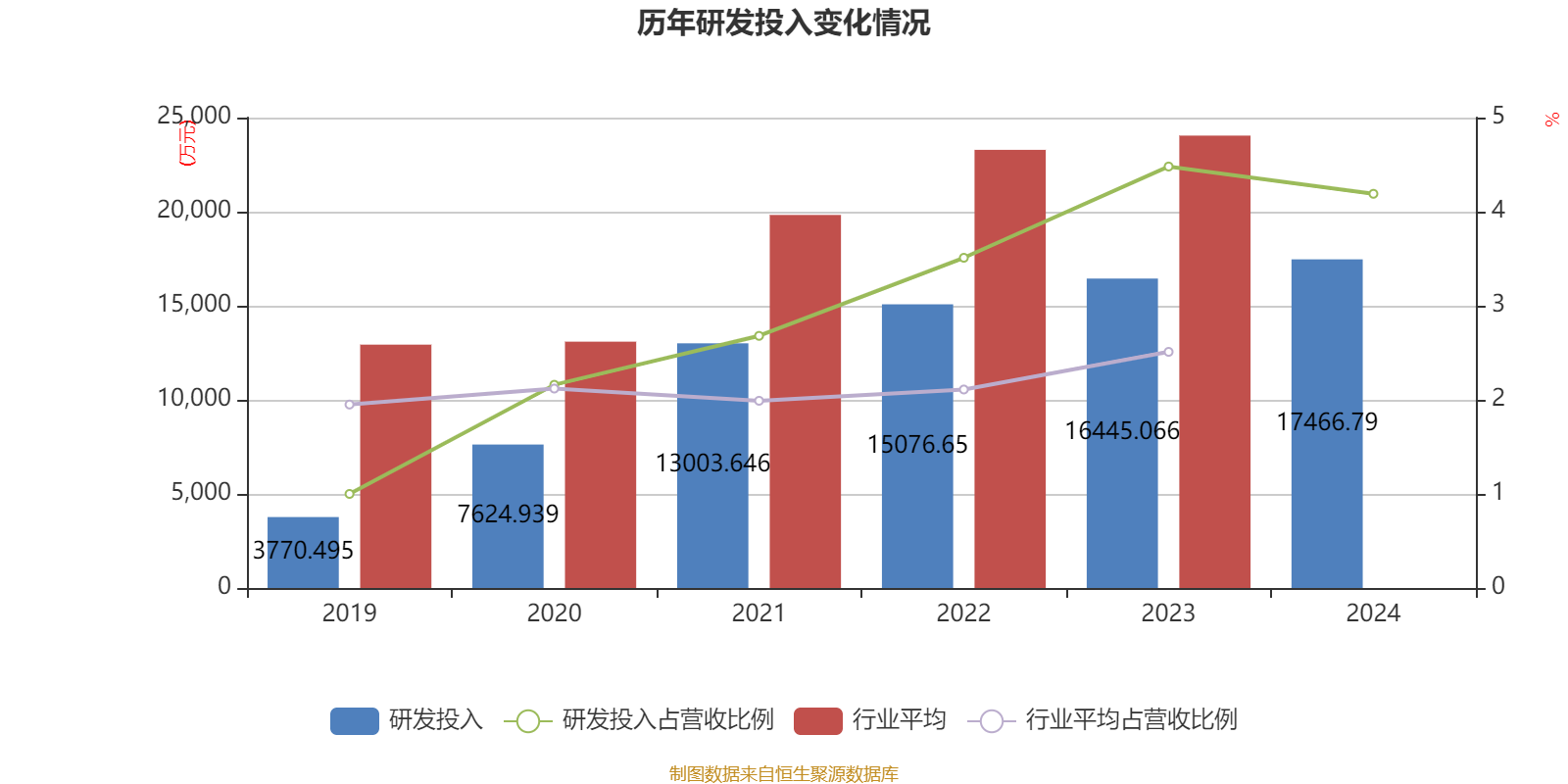 2024年全年京海策略,公司研发投入金额为1.75亿元,同比增长6.21%;研发投入占营业收入比例为4.19%,相比上年同期下降0.29个百分点。此外,公司全年研发投入资本化率为0%。