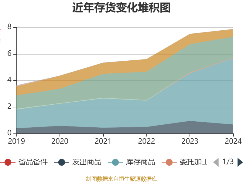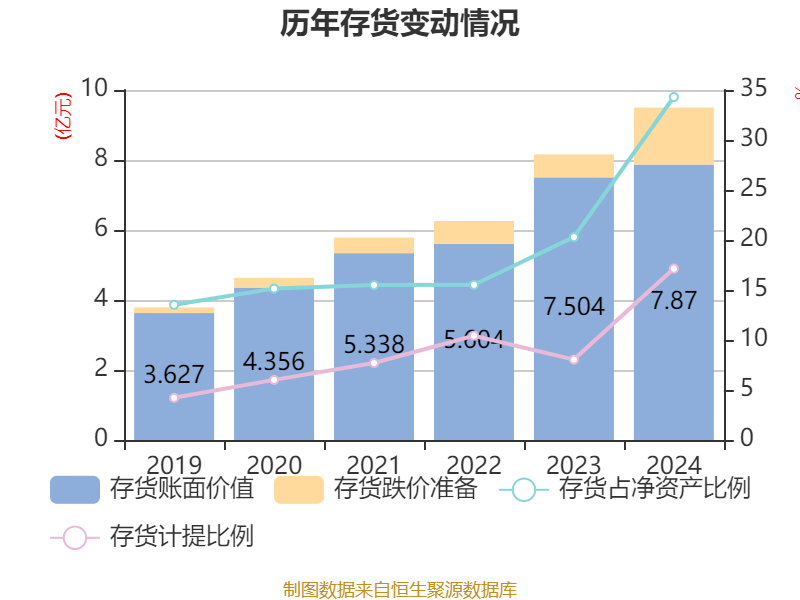 从存货变动来看,截至2024年末,公司存货账面价值为7.87亿元,占净资产的34.3%,较上年末增加3662.91万元。其中,存货跌价准备为1.63亿元,计提比例为17.14%。