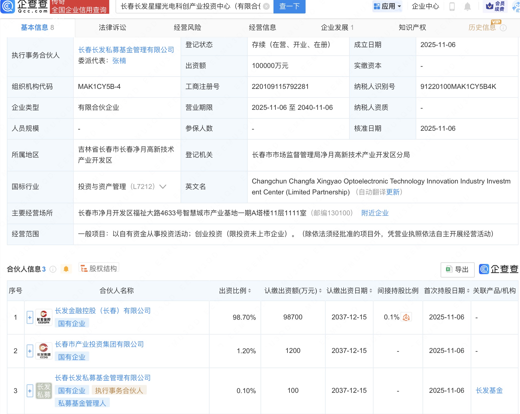近日,长春长发星耀光电科创产业投资中心(有限合伙)成立,出资额10亿人民币,经营范围为以自有资金从事投资活动、创业投资。企查查股权穿透显示牛领策略,该企业由长发金融控股(长春)有限公司、长春市产业投资集团有限公司、长春长发私募基金管理有限公司共同出资。